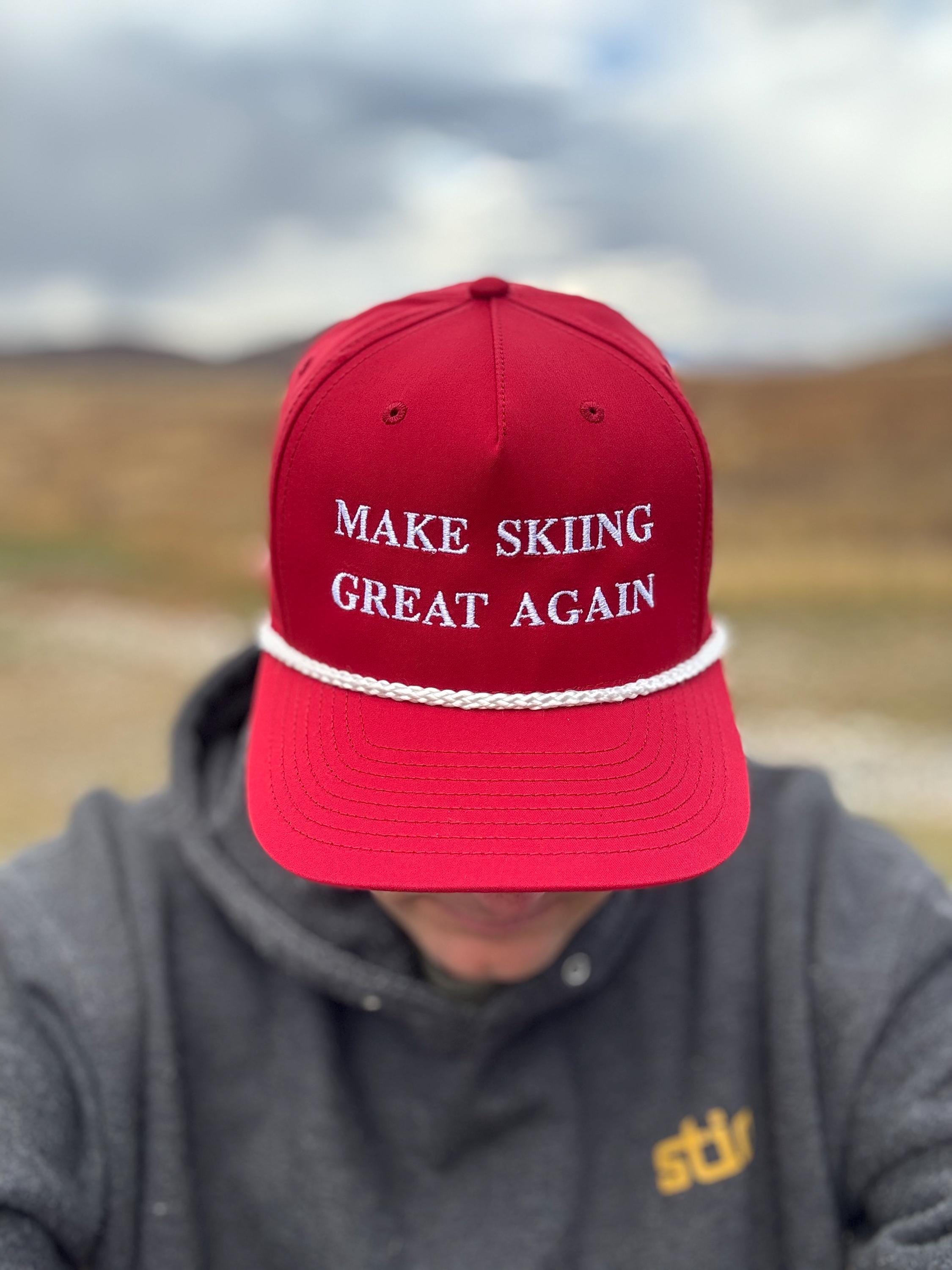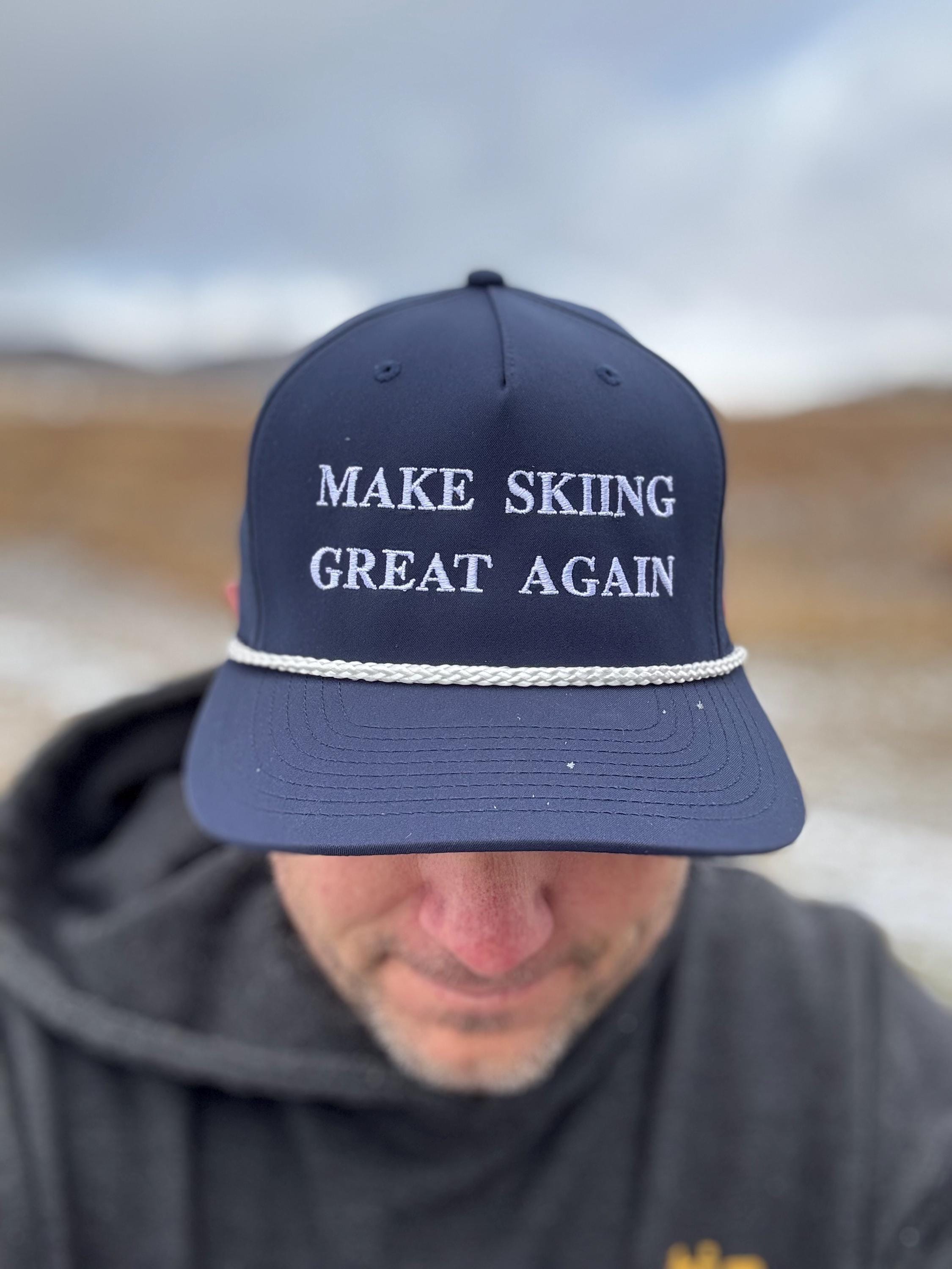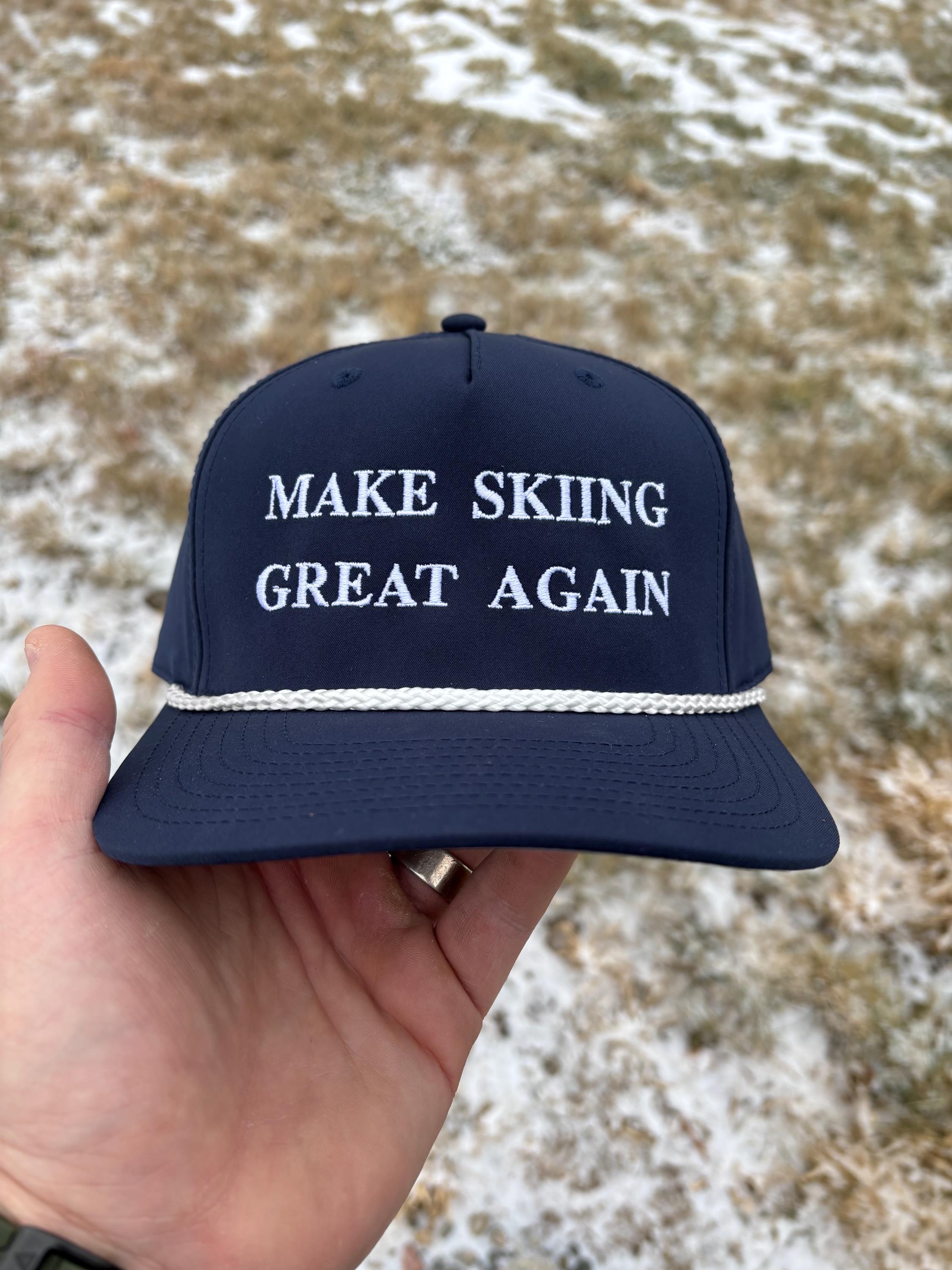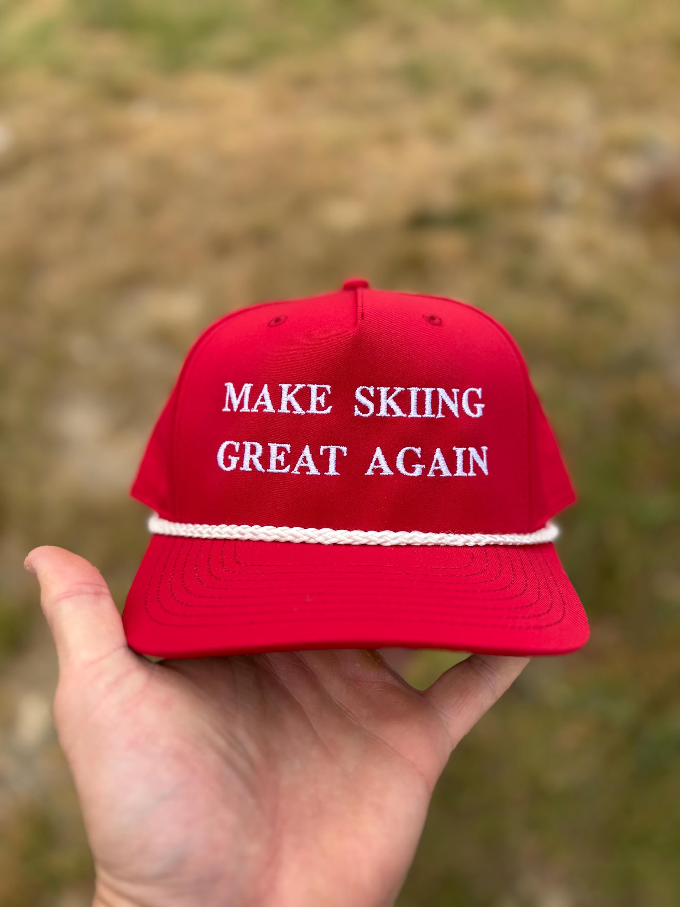 Fun Skiing hat. These hats are sure to turn heads. Adjustable snap back fits most head sizes. Made from Richardson 258 hats.