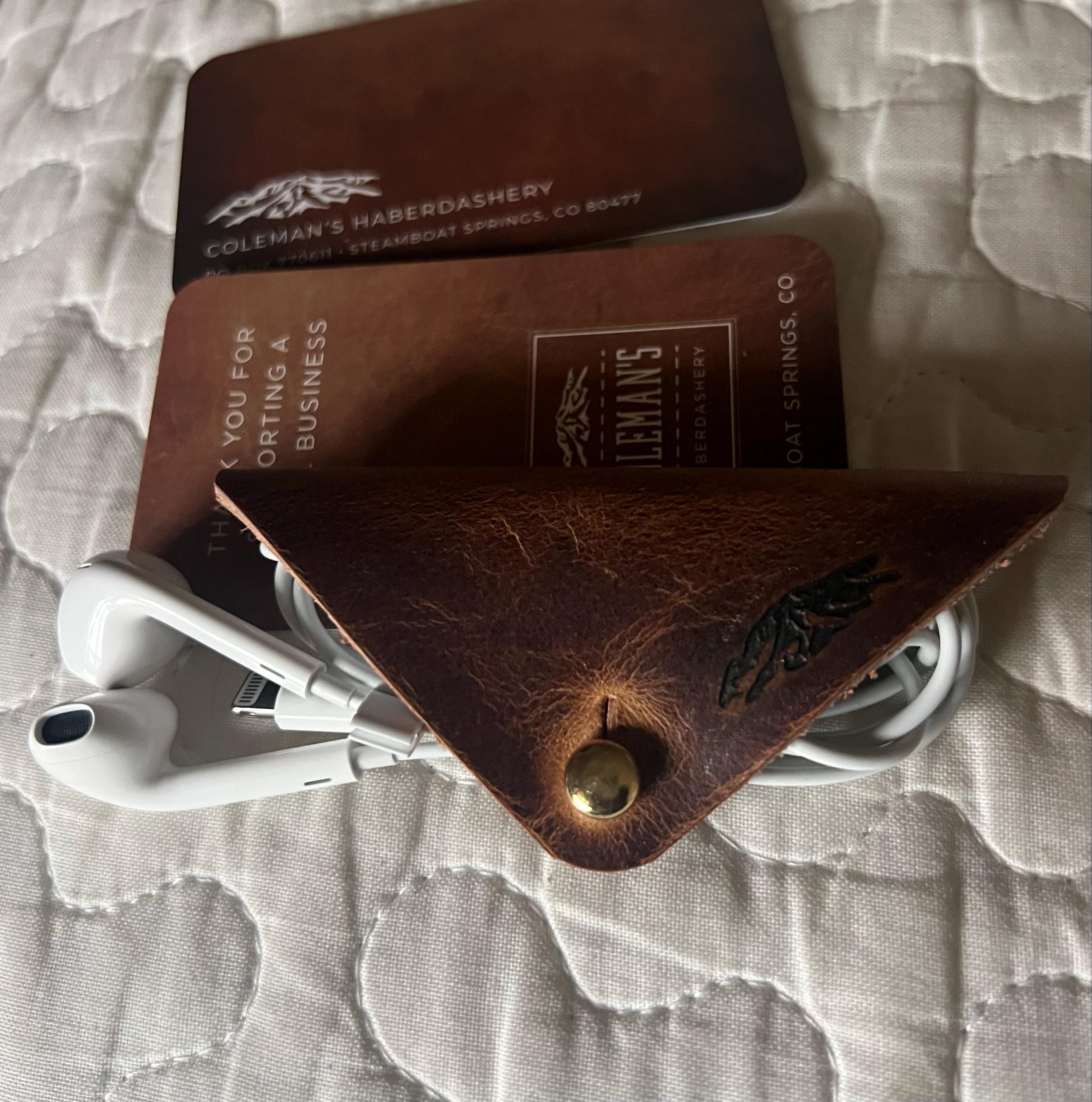 Our CORD WRANGLER is a simple design of bison leather works wonderfully to keep those unruly cords, earbuds and cables in check! It provides great compact organization for the multitude of tech tangles whether for travel, home, car or office. Helps to keep you cords or earbuds tidy for your purse, bag or pockets. Easy to use and each Wrangler is one-of-a-kind owing to the organic quality of Bison Leather.