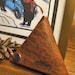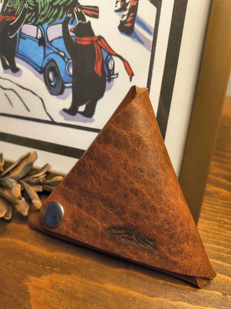 This foldable Bison leather coin pouch measures 3.75” on each side and fits nicely into pockets as well as purses or clutches. This wonderfully simple triangular design is unique and functional.