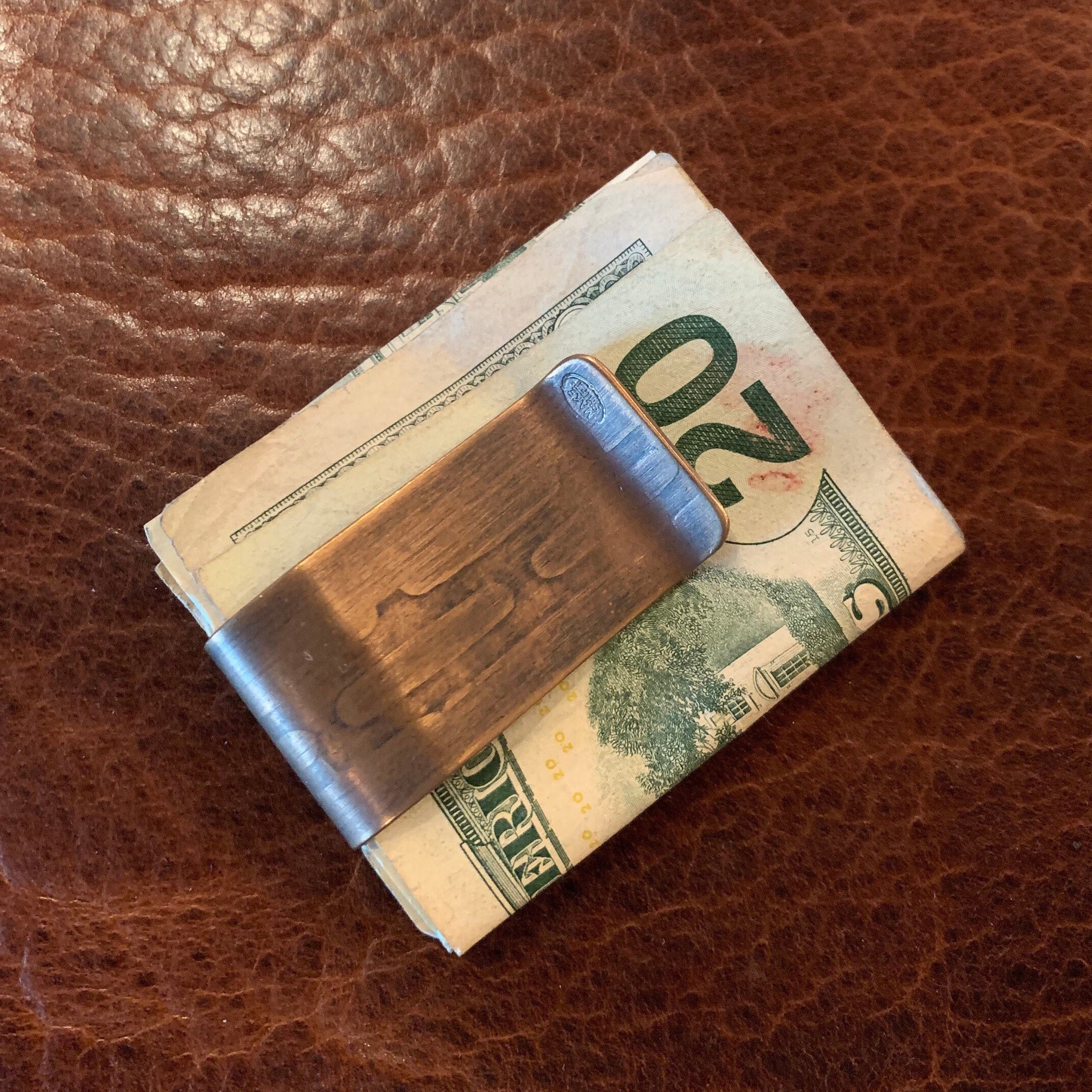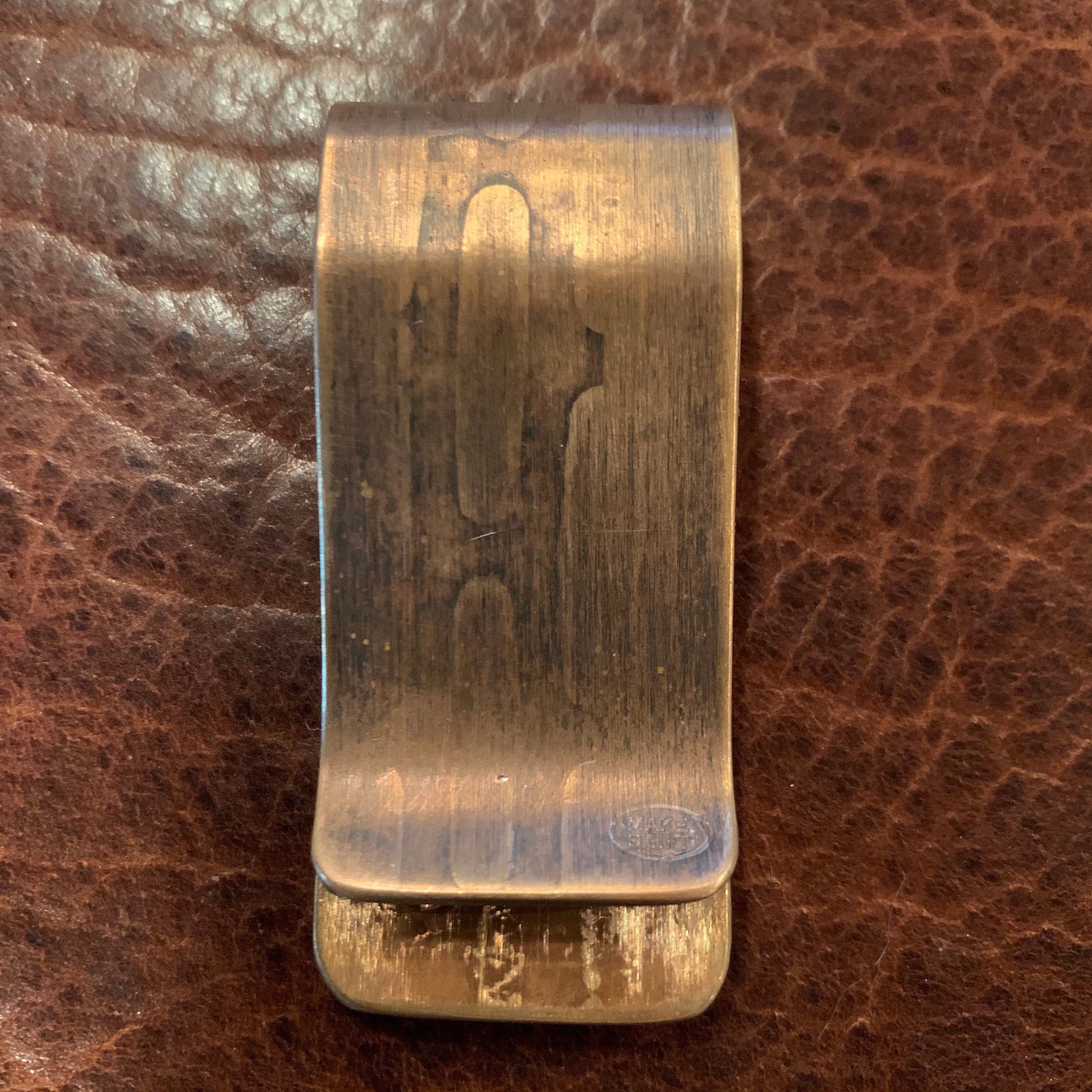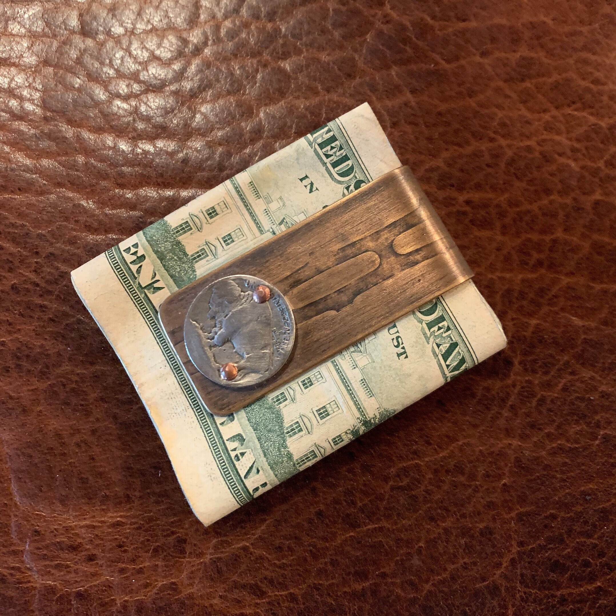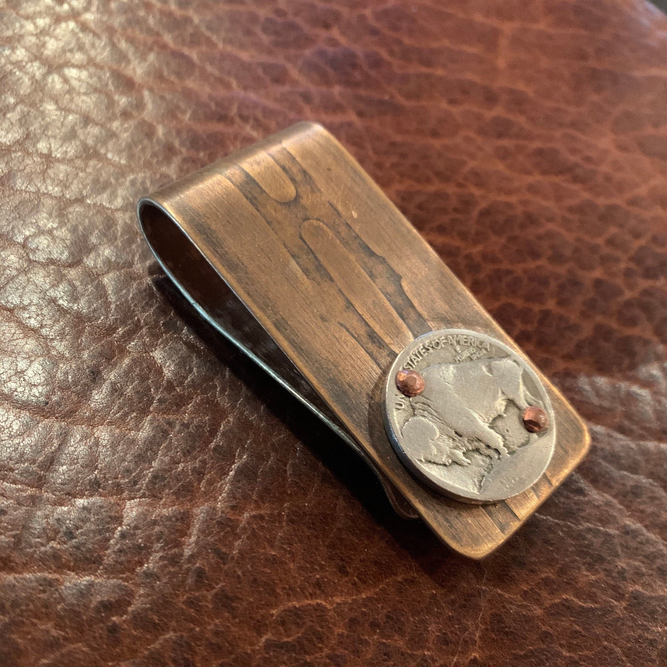 Reclaimed Bronze and Brass money clip from Vietnam war Artillery Casings. Hand-riveted with vintage buffalo nickel for added style.